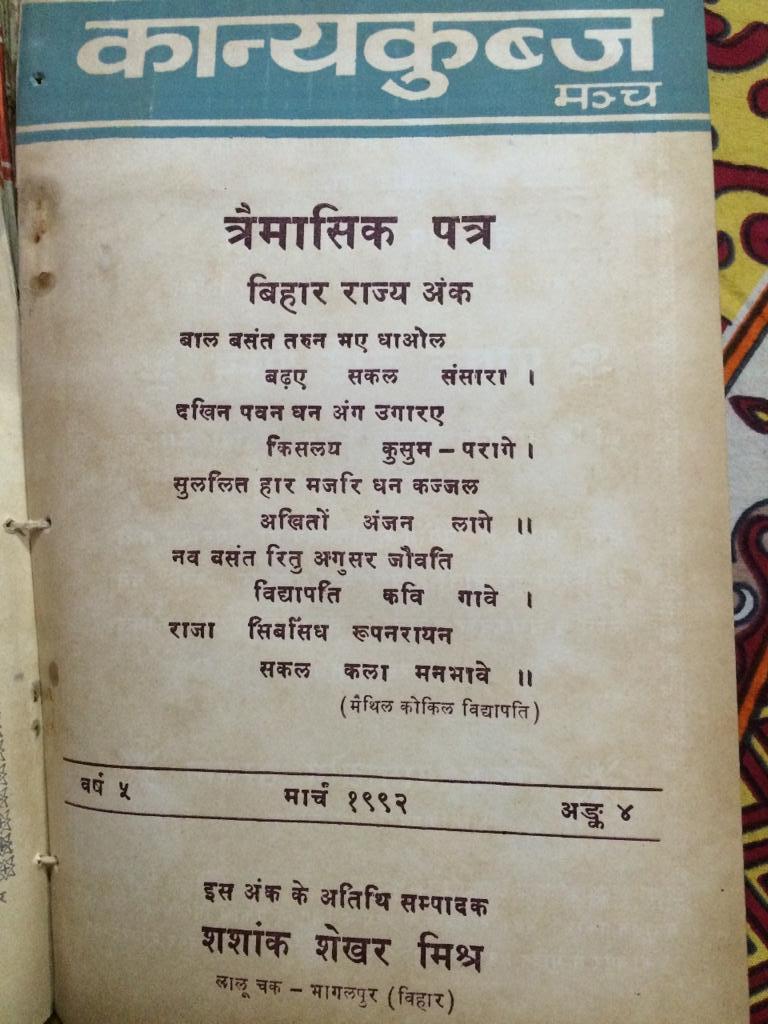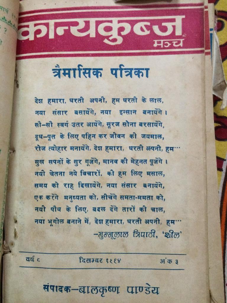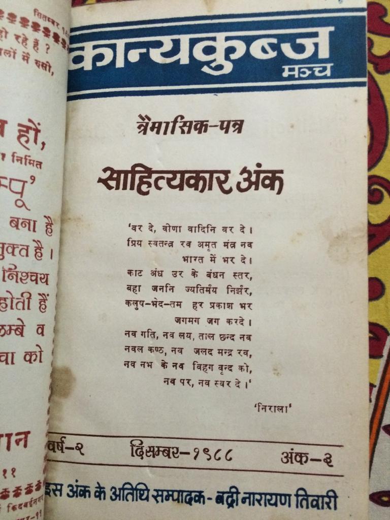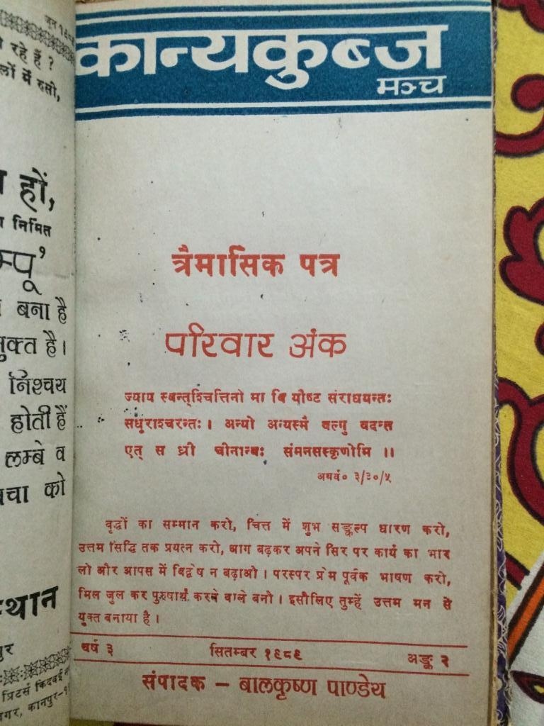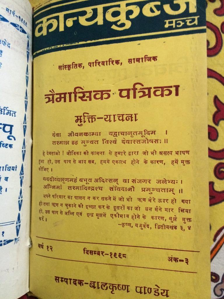 वर्ष १९८७ में संस्कृत श्री राम शुक्ल, पंडित ब्रिज बिहारी अवस्थी, पंडित रामेश्वर दयाल मिश्र के परमस एवम आचार्य बाल कृष्णा पांडेय की प्रबल ीचा शक्ति से कान्यकुब्ज मंच ( त्रि मासिक) के प्रथम अंक का विमोचन डॉक्टर सोम नाथ शुक्ल, पंडित ब्रिज बिहारी अवस्थी, पंडित गोर लाल त्रिपाठी आदि की समुपसिथित में ३० मई, १९८७ कार्यालय २०-बी ब्लॉक किदवई नगर में सम्पन हुआ |